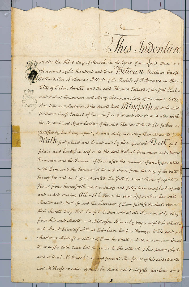 In the early 1800s, Exeter continued to benefit from wealth generated by the wool trade. The period was characterised by a ‘spirit of improvement’ when the implications of science, reason and the Enlightenment began to be felt. William Carss Pollard, son of Thomas, completed his own training in 1812 and was able to establish William Pollard & Co a little later. He was an original ‘subscriber’ of the Devon and Exeter Institution (DEI) where new ideas were recorded, shared and debated. Early books printed by Pollards are still preserved there.