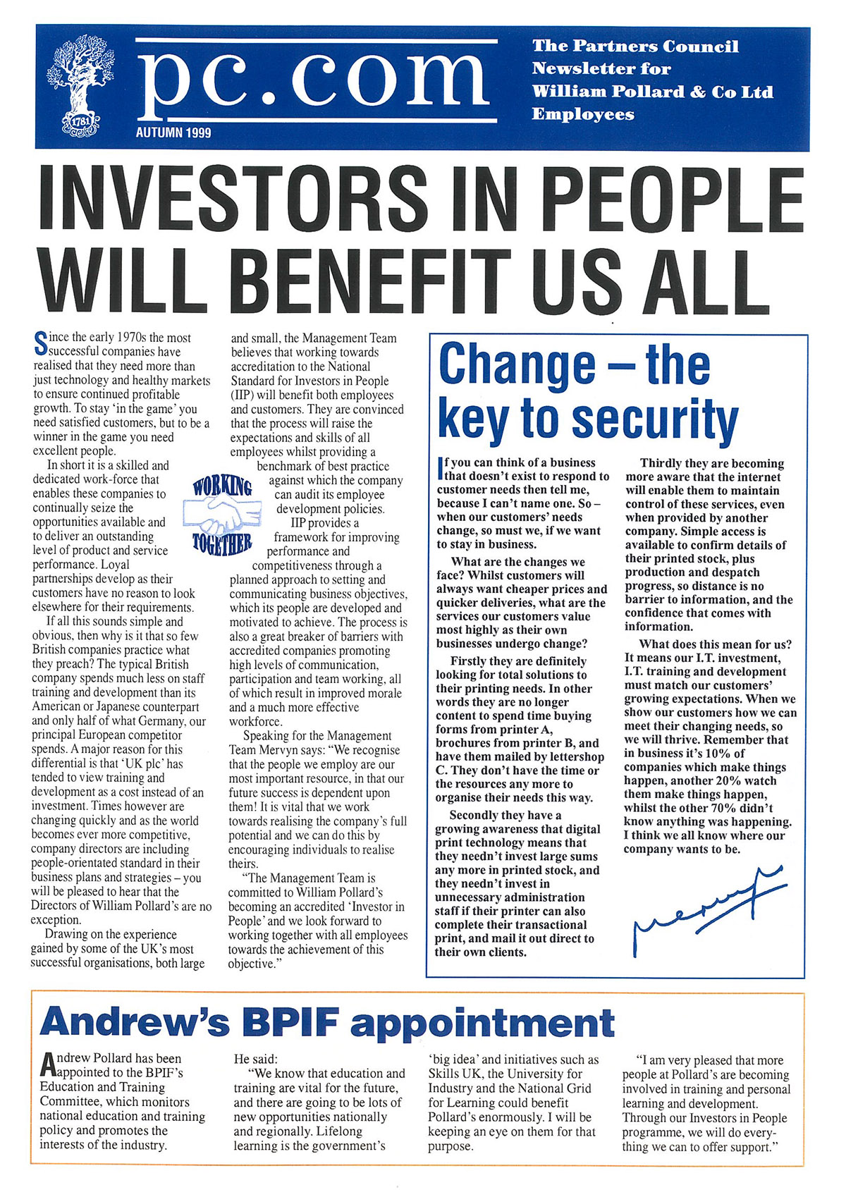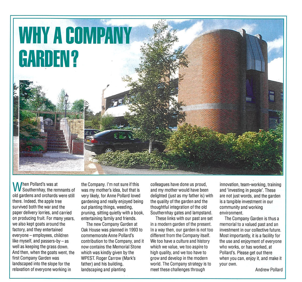 At the 2000 Millennium, Andrew Pollard’s message to staff conveyed one aspect of the company ethos: ‘Pollards is a bit unusual they tell me. But why? Well, I think we are trying to do something a bit special, because the invitation to everyone who works here is to build a collective a sense of purpose. That’s what makes the company distinctive. Despite the continuing contraction within the print industry, we aim to work together, innovate together, and share success.’ A garden for staff use was completed in 1999, and the story behind it conveys something of Pollards underlying values and commitments. Over the years, Pollards has supported various forms of employee participation, including employee shareholding, board representation and top-level consultation. In 1984 the William Pollard Employee Shareholding Trust (WPEST) was established and given company shares, with the management holding a small number too. A ‘Partners’ Council’ later complemented the shareholding by providing a space for discussion of company business. By 2011 more specific and tax-efficient bonus systems had been developed, and the trust was wound up. Today, the Pollards Employee Consultation Committee (PECC) meets with the Chairman and Managing Director before every Board Meeting to raise any issues they wish. After Board deliberation, prompt feedback enables discussion within departments.