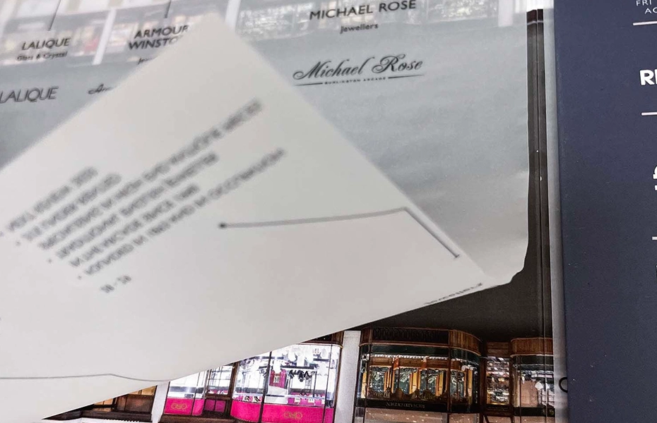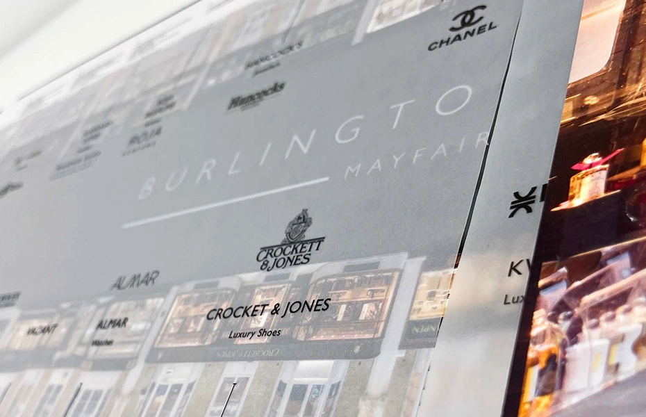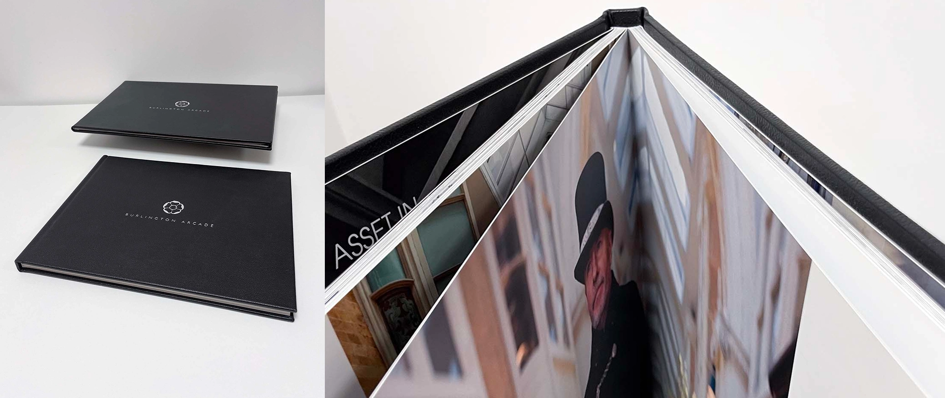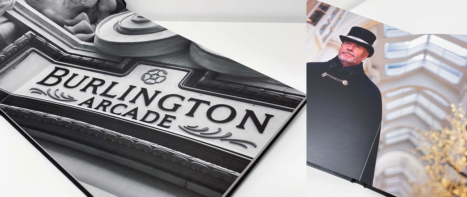 Burlington Arcade commissioned a premium booklet reflecting their heritage. We delivered a leather-bound, lay-flat book with a de-bossed silver foil logo, plus an elegant stores guide featuring a bird’s-eye view of the arcade with translucent overlays.